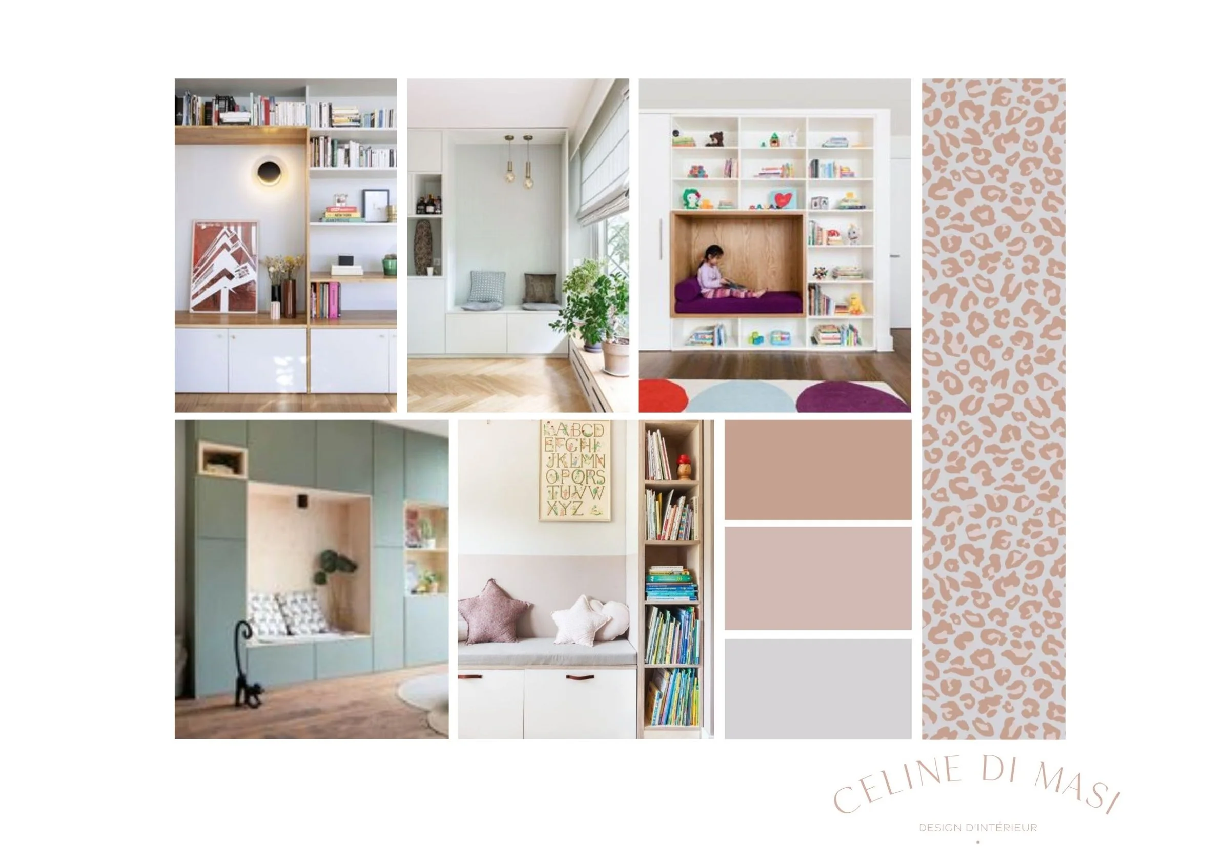 Les clients souhaitaient rentabiliser l’espace du pallier du 1ier étage pour y caser des rangements supplémentaires pour leurs filles. Après discussions, il nous semblait plus opportun de revoir tout l’espace disponible pour créer un rangement sur mesure mais aussi une zone de calme pour les filles qui lisent énormément. Nous avons créée une niche de lecture “girly” parmi les rangements composés de caissons issu de la grande distribution.